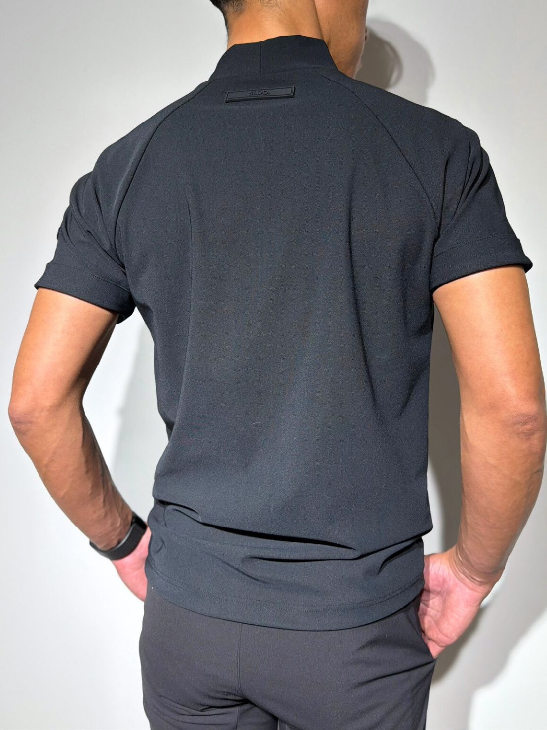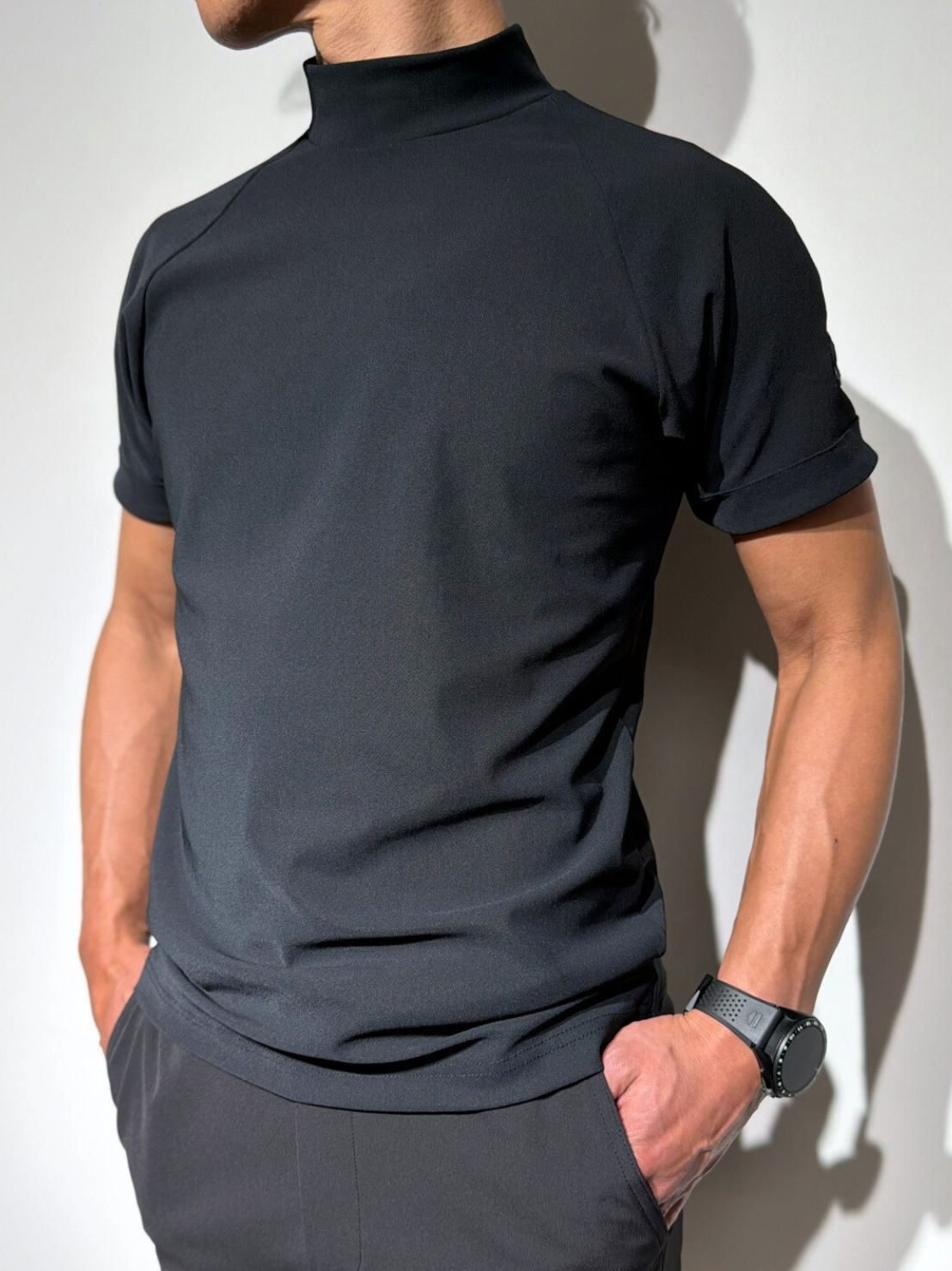 清潔感と機能性を備えた、大人のためのスマートな半袖モックネックです。