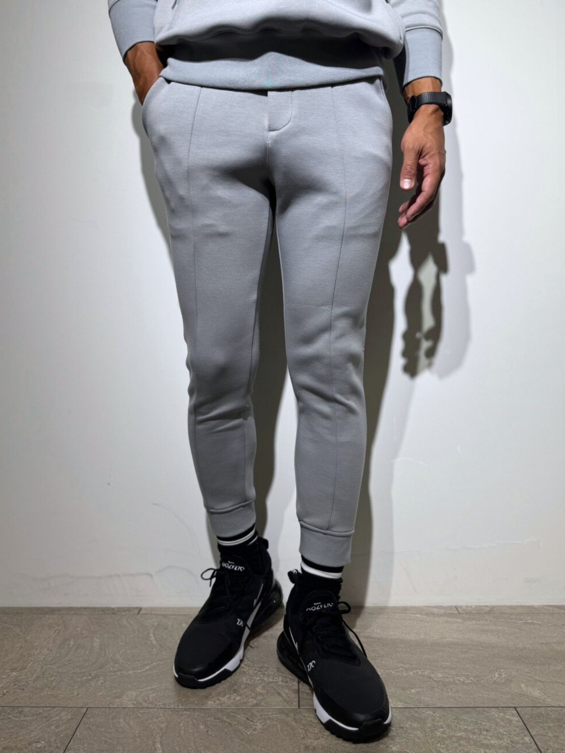 高級感ある質感と適度な厚み、ハリとコシを兼ね備えたダンボールニット素材を採用。裾のファスナーは裏使いにすることで膨らみを抑え、カジュアルに寄りすぎないスマートな印象へと仕上げました。