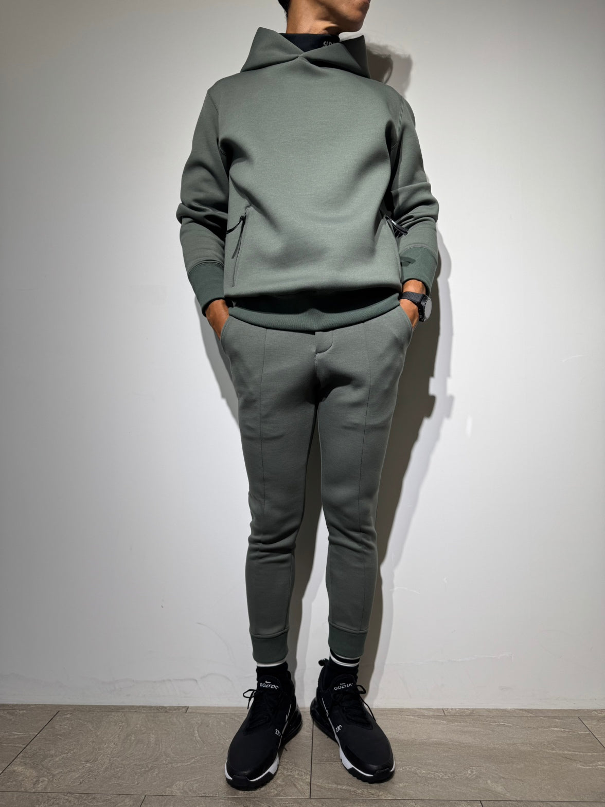 高級感ある質感と適度な厚み、ハリとコシを兼ね備えたダンボールニット素材を採用。裾のファスナーは裏使いにすることで膨らみを抑え、カジュアルに寄りすぎないスマートな印象へと仕上げました。