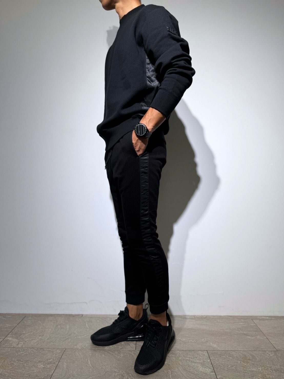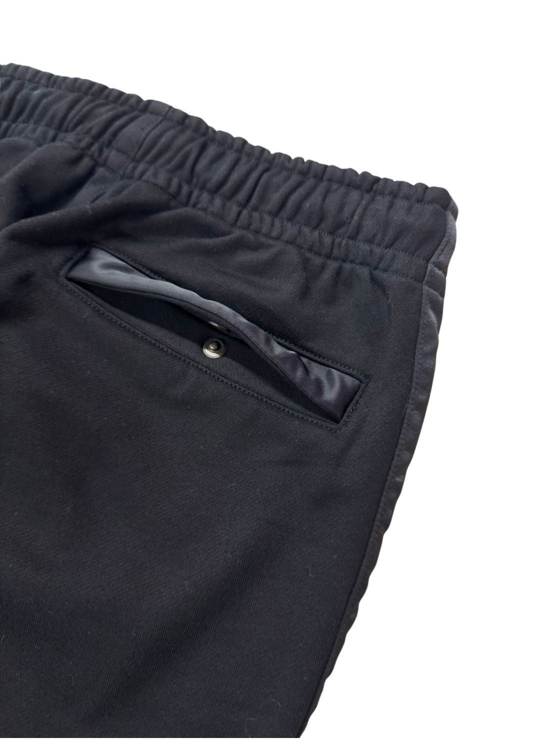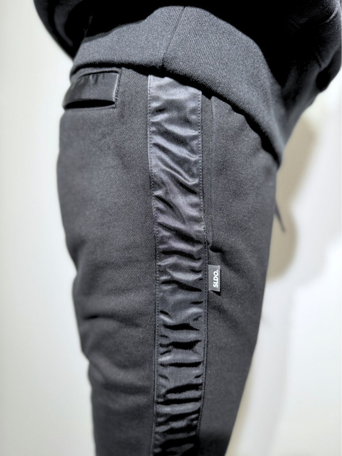 さらっとした風合いの裏毛コットンをベースに、上品でしなやかな艶を持つ高級サテンをサイドに切り替えることで、スポーティーでありながらもラグジュアリーな印象を演出しています。