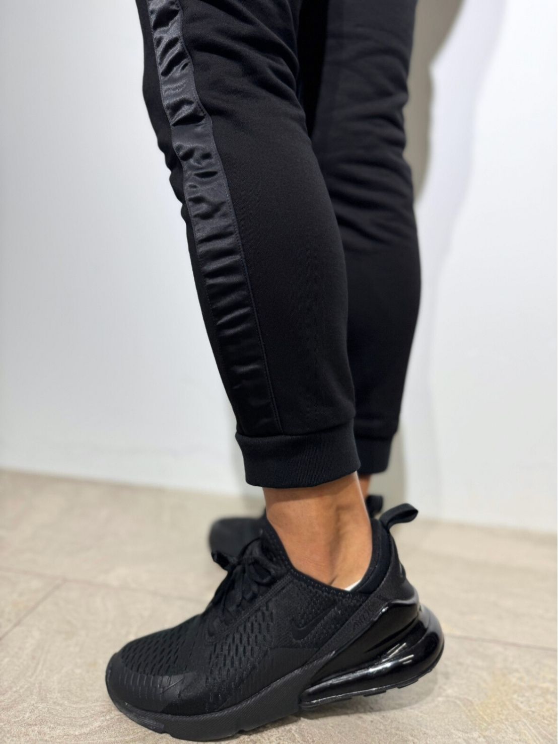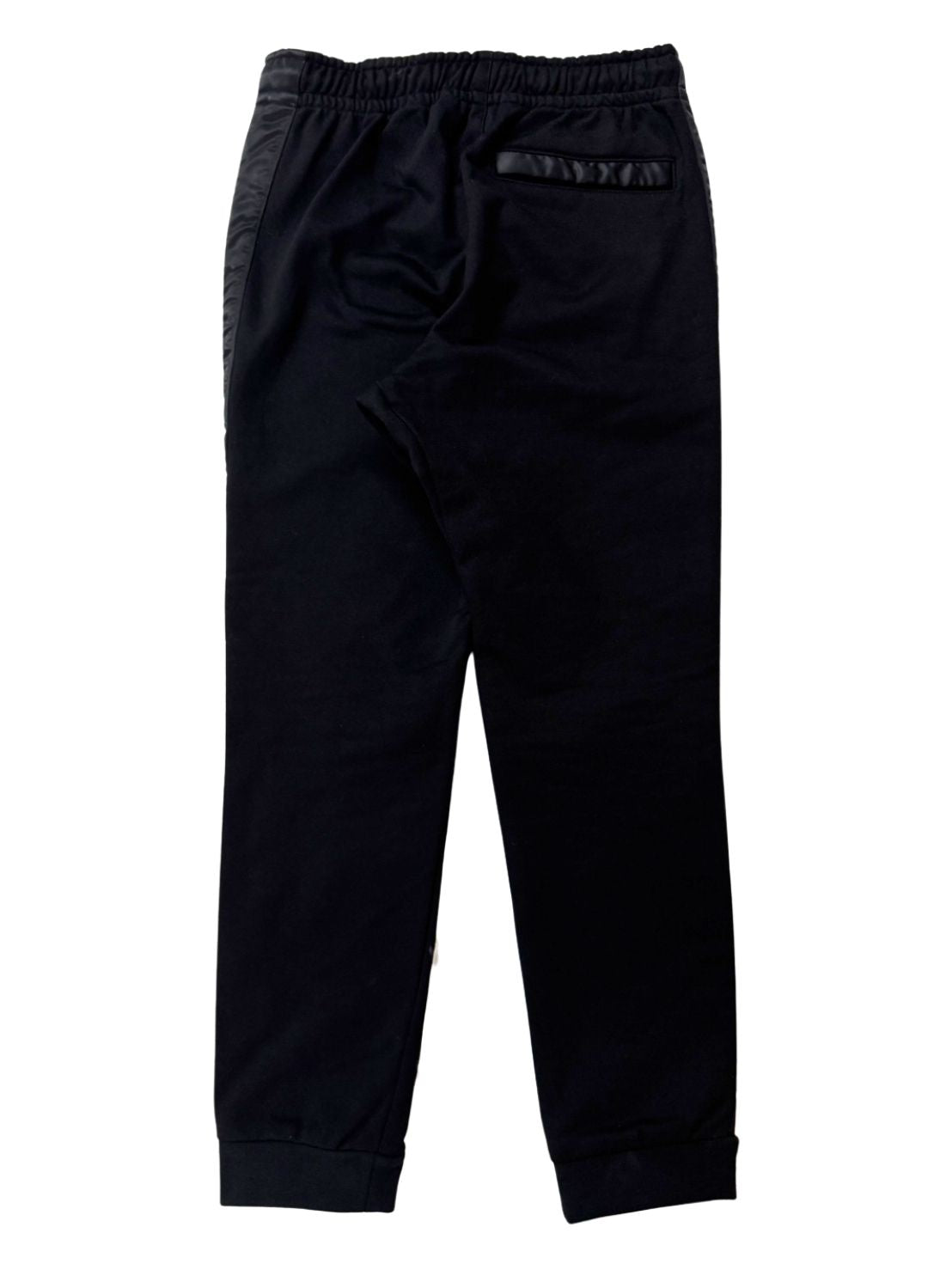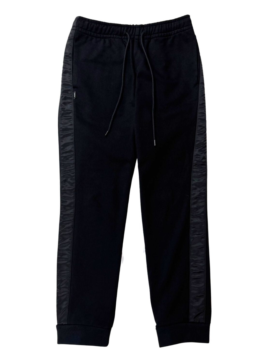 さらっとした風合いの裏毛コットンをベースに、上品でしなやかな艶を持つ高級サテンをサイドに切り替えることで、スポーティーでありながらもラグジュアリーな印象を演出しています。