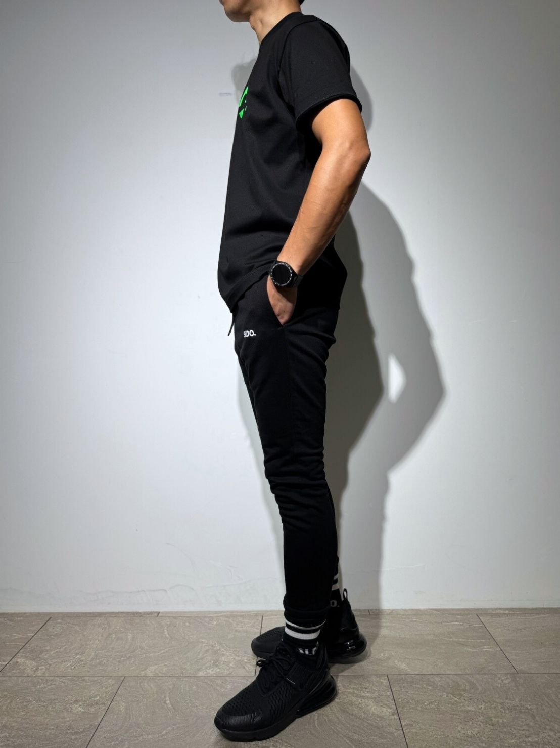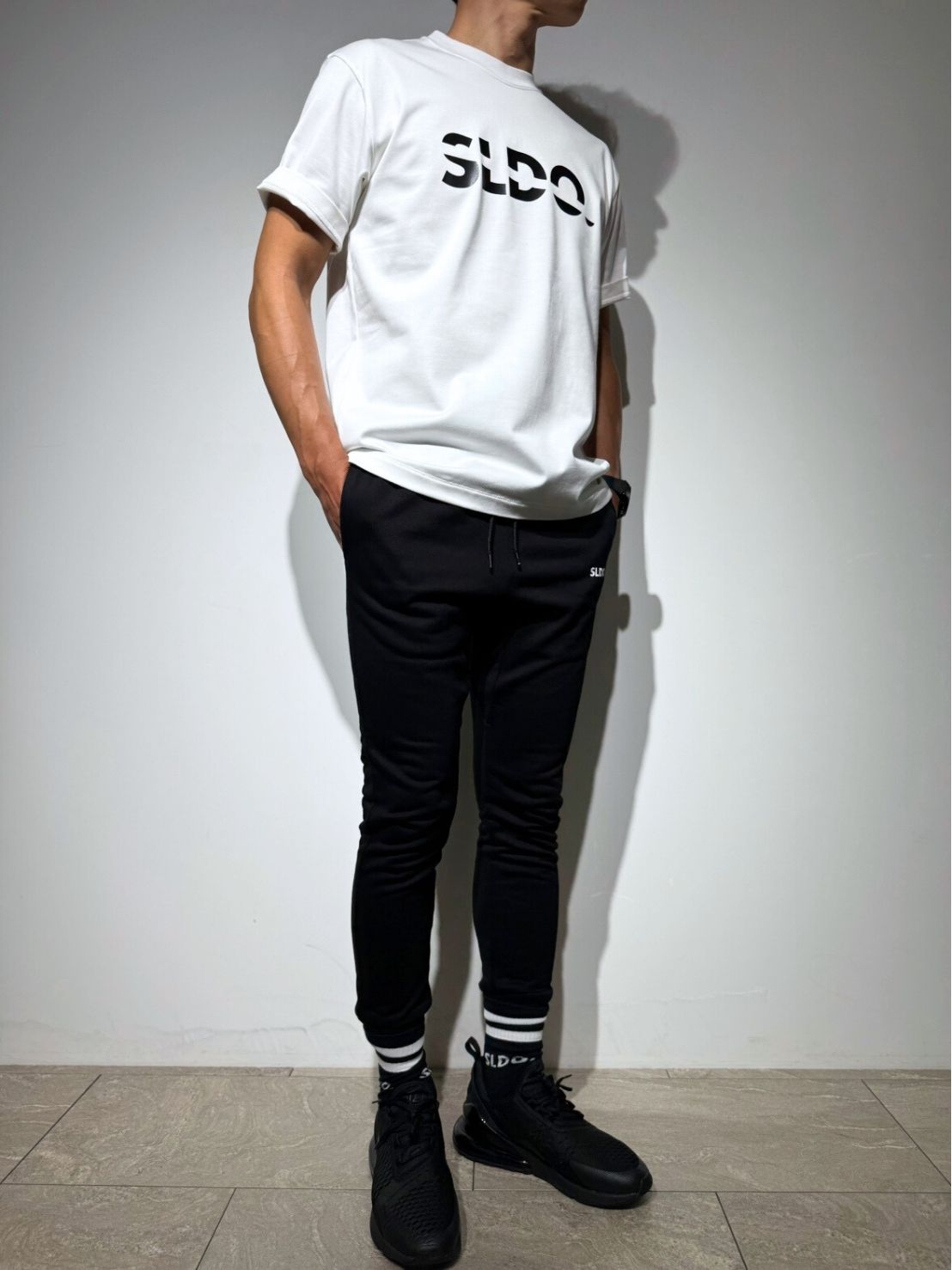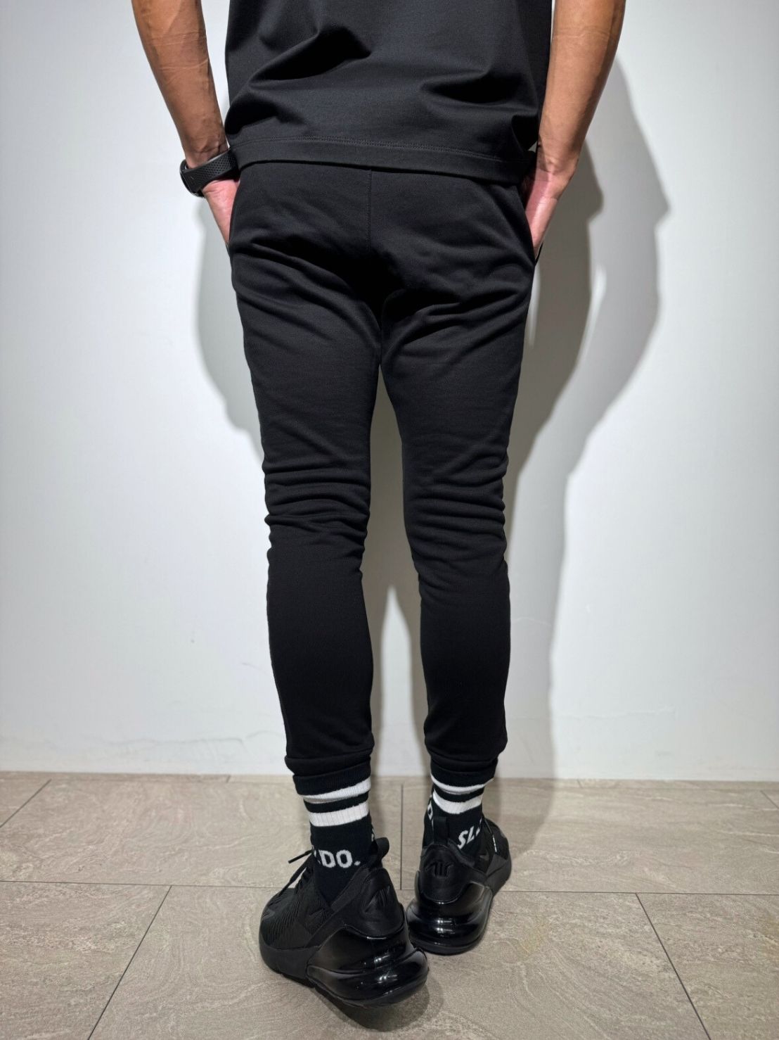 従来のスウェットパンツ特有のカジュアルさとは一線を画す、ブラックスラックスのようなキレイで洗練されたシルエット。